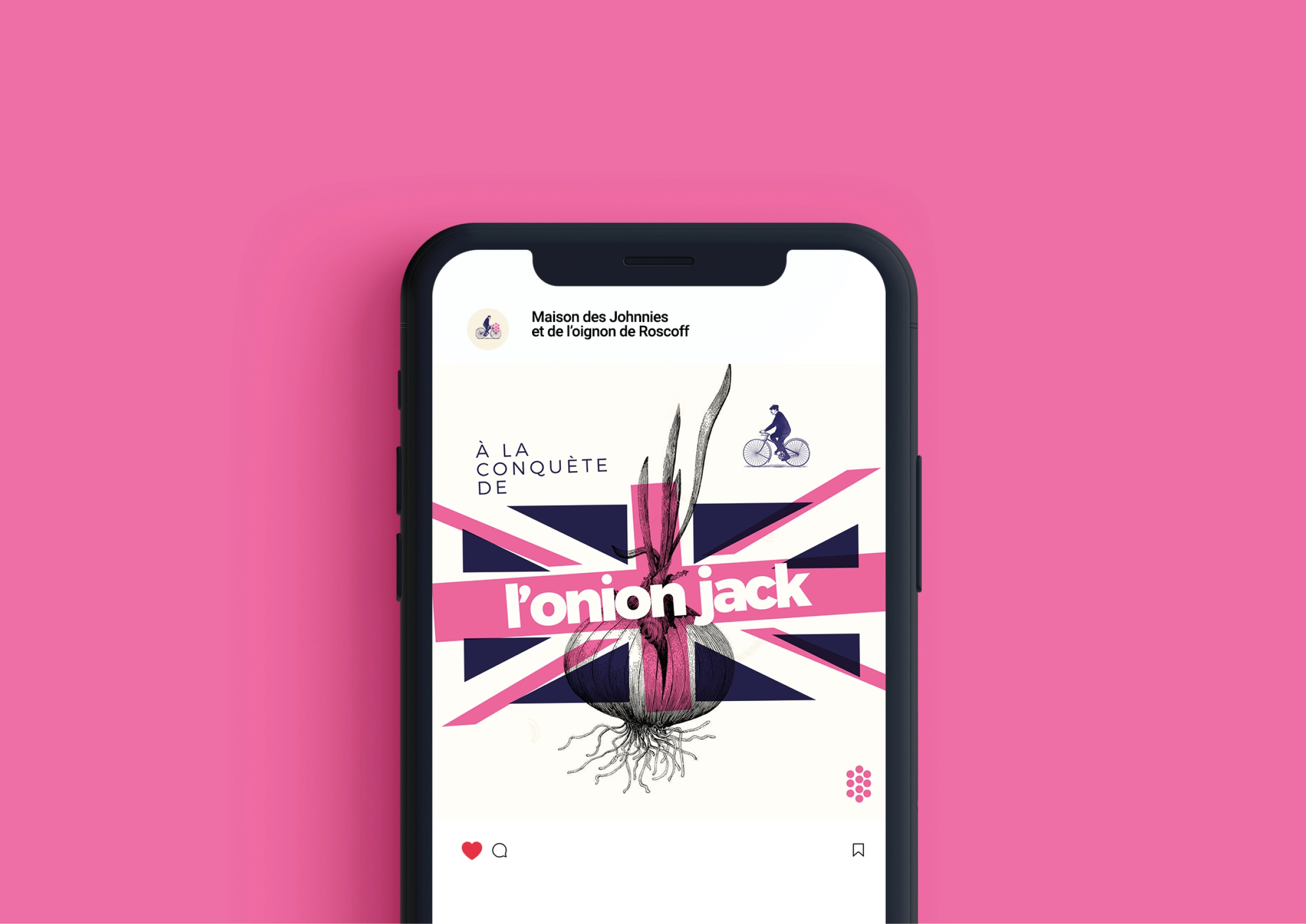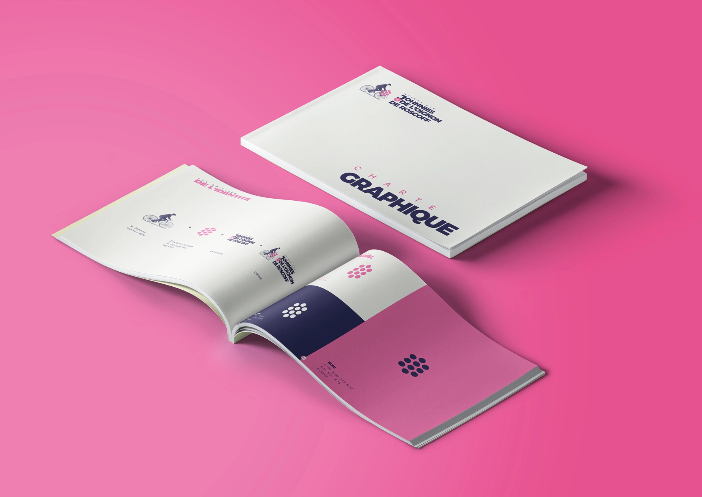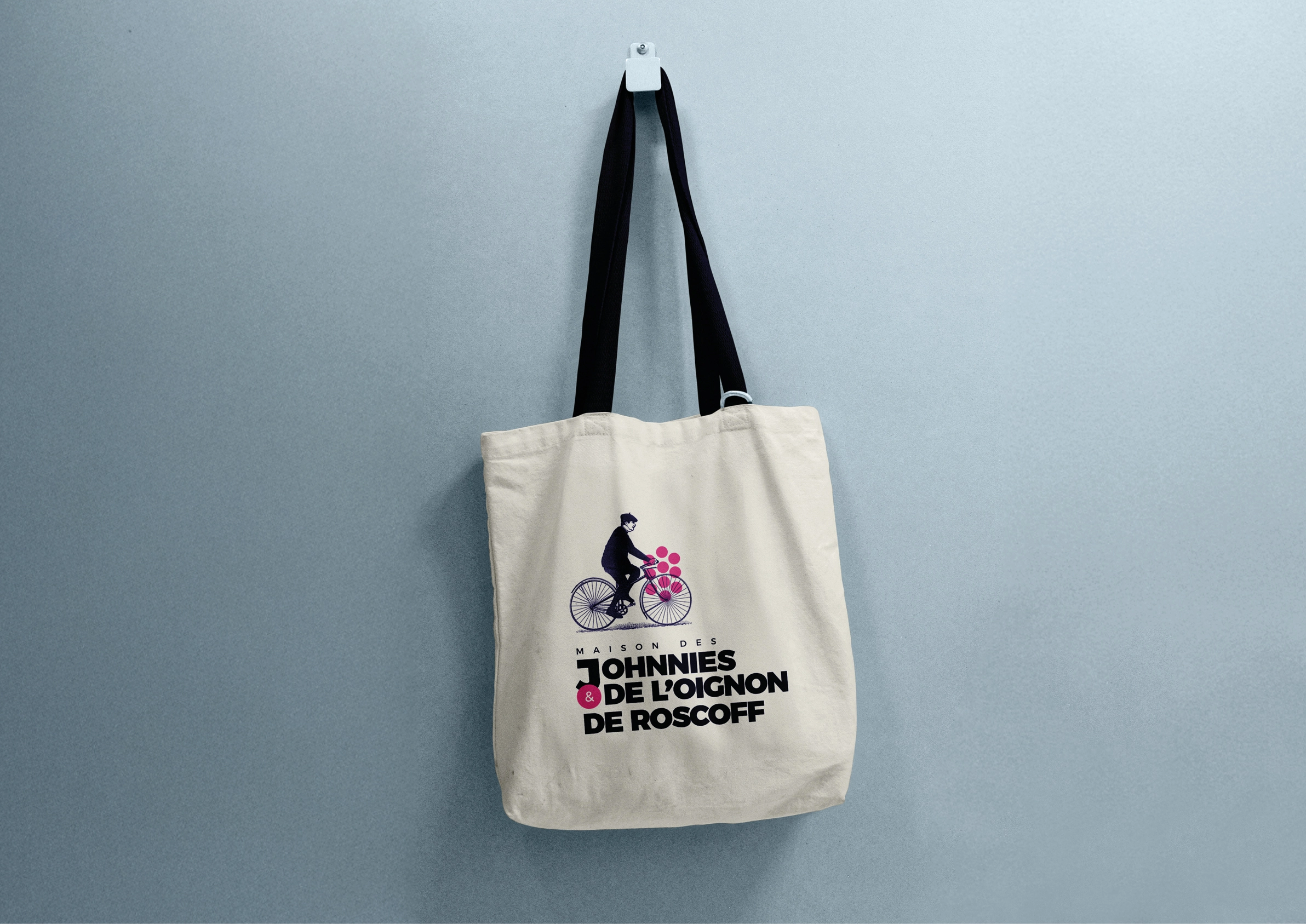 Nous avons conçu une identité graphique empreinte d’histoire et de mouvement, mettant en scène le Johnny sur son vélo — figure emblématique du territoire — dans un style figuratif accessible. La tresse d’oignons, autre symbole fort de cette tradition, a été stylisée pour fonctionner comme un repère visuel déclinable sur tous les supports. Cette identité allie tradition et modernité.